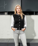 The college style presents itself as a cool stylish women's jacket with contrasted cuffs to offer a preppy look and feel. The inside brushed sweat fabric ensures a comfortable fit. Typical details include; striped rib cuffs at the collar, hem and sleeves and metal press-buttons to emphasize the cool look. Two pockets on the front, set-in sleeves and neck half-moon with neck tape.